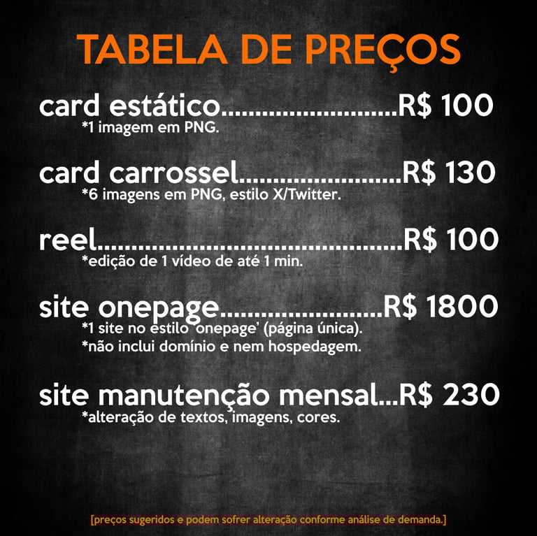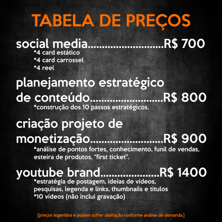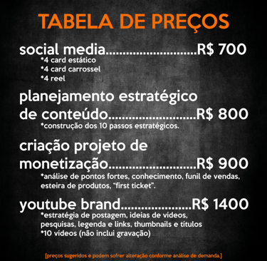 Confira nossos preços e serviços. Para outros serviços, ou para tirar alguma dúvida, podemos marcar uma reunião on-line: a famosa "call" para alinhamentos.