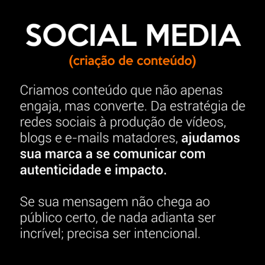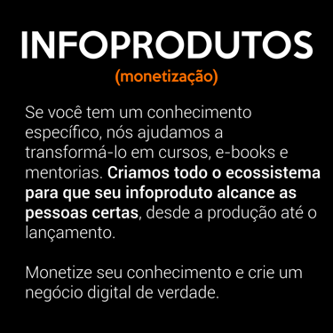 Somos uma agência de marketing digital focada em estratégia, social mídia e infoprodutos. Ajudamos negócios, marcas pessoais e criadores a se destacarem no mercado com posicionamento forte, comunicação certeira e estratégias que realmente funcionam.